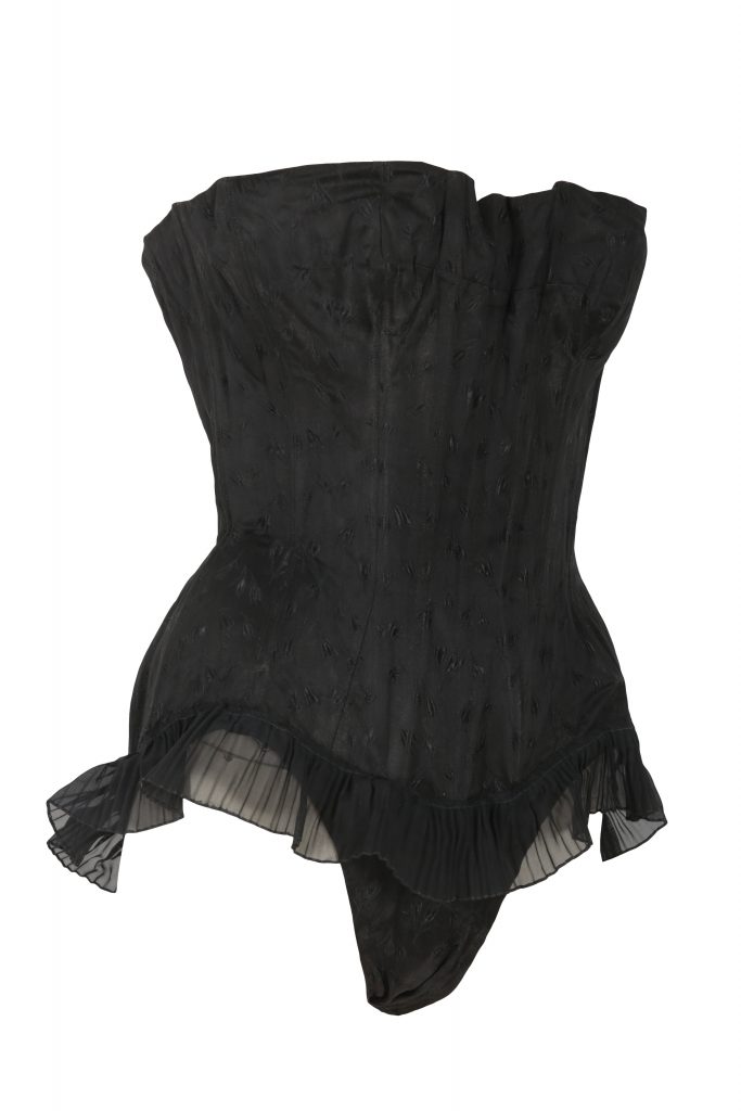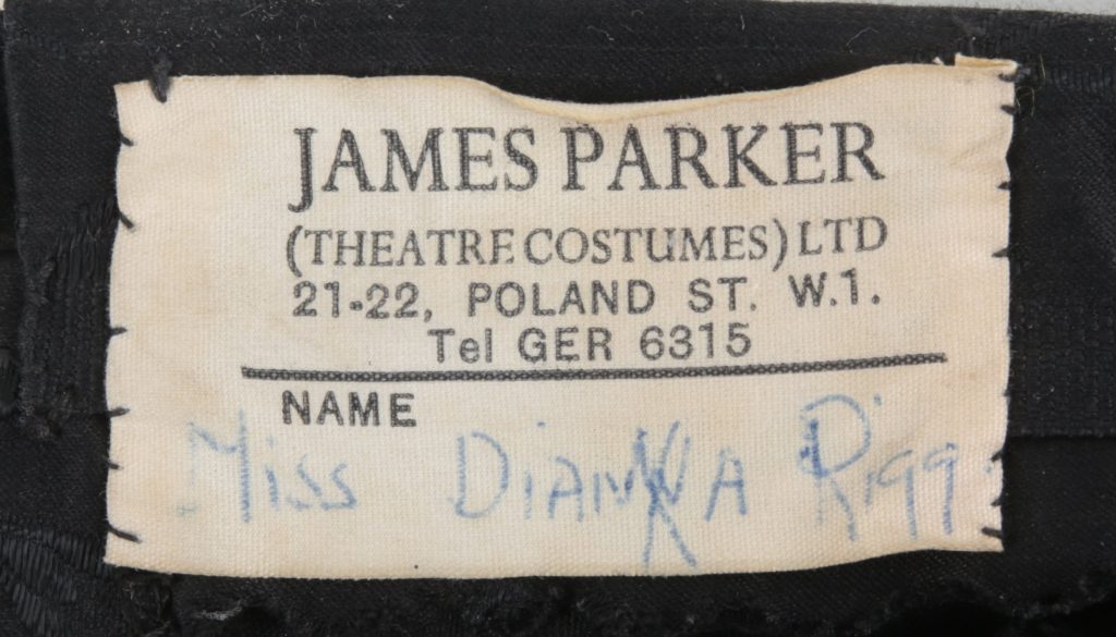 Mais Duke’s nous en apprend davantage sur cet objet étonnant : « conçu par Rigg elle-même (selon la légende) et fabriqué par James Parker, le corset porte une étiquette Parker au nom de Rigg. Il a été porté par Diana Rigg dans son interprétation de Mrs Emma Peel dans l’épisode A Touch of Brimstone de la série d’espionnage The Avengers, diffusé pour la première fois le 15 février 1966. Provenance : acheté par un projectionniste lors d’une vente de liquidation aux studios Elstree, à Borehamwood, à la fin des années 1960, puis transmis par descendance familiale. »